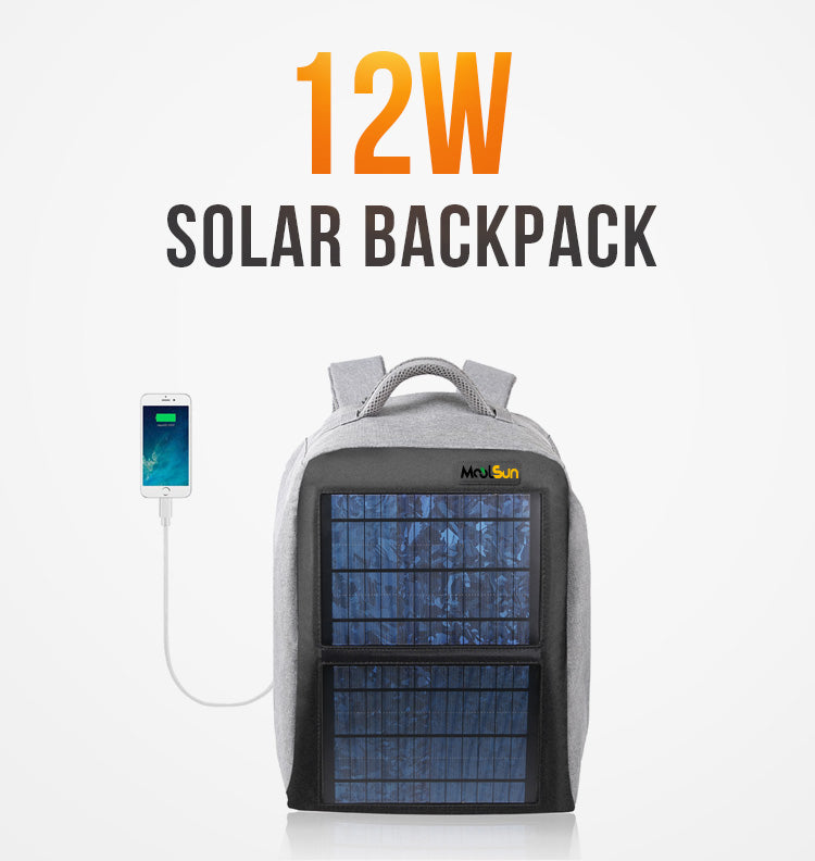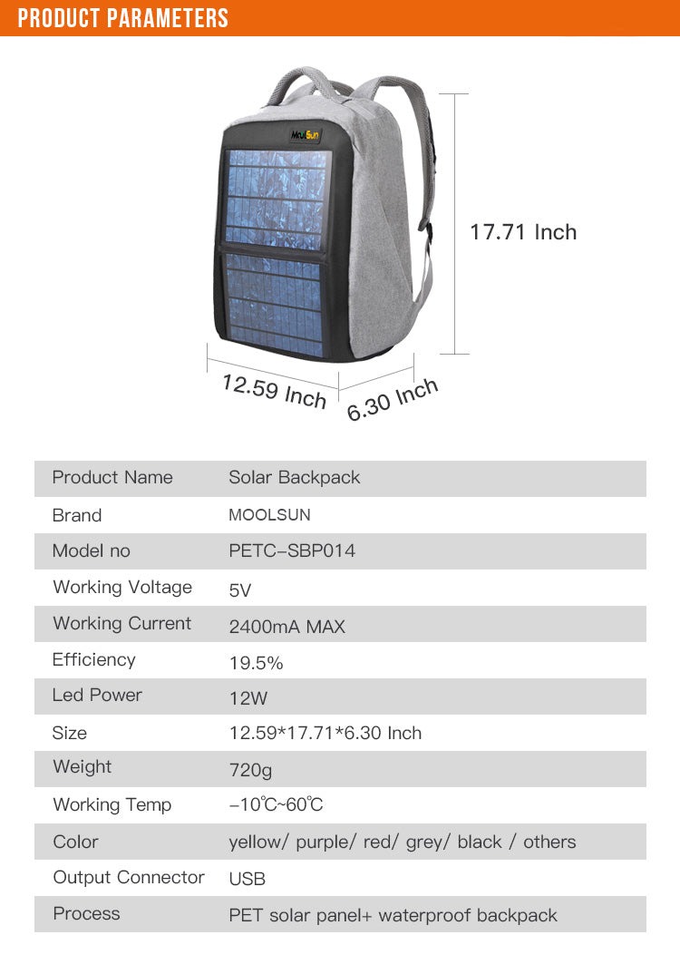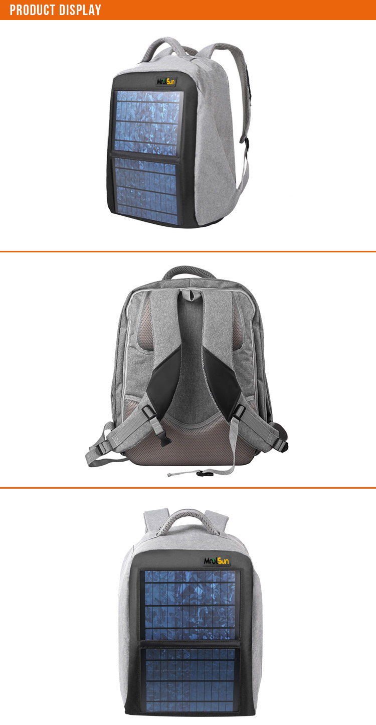 Solar chargers for electronic devices with 5V USB ports is compatible with any USB powered 5V input voltage devices, such as phones and other USB devices. The Solar panels are built-in and fastened to the backpack.